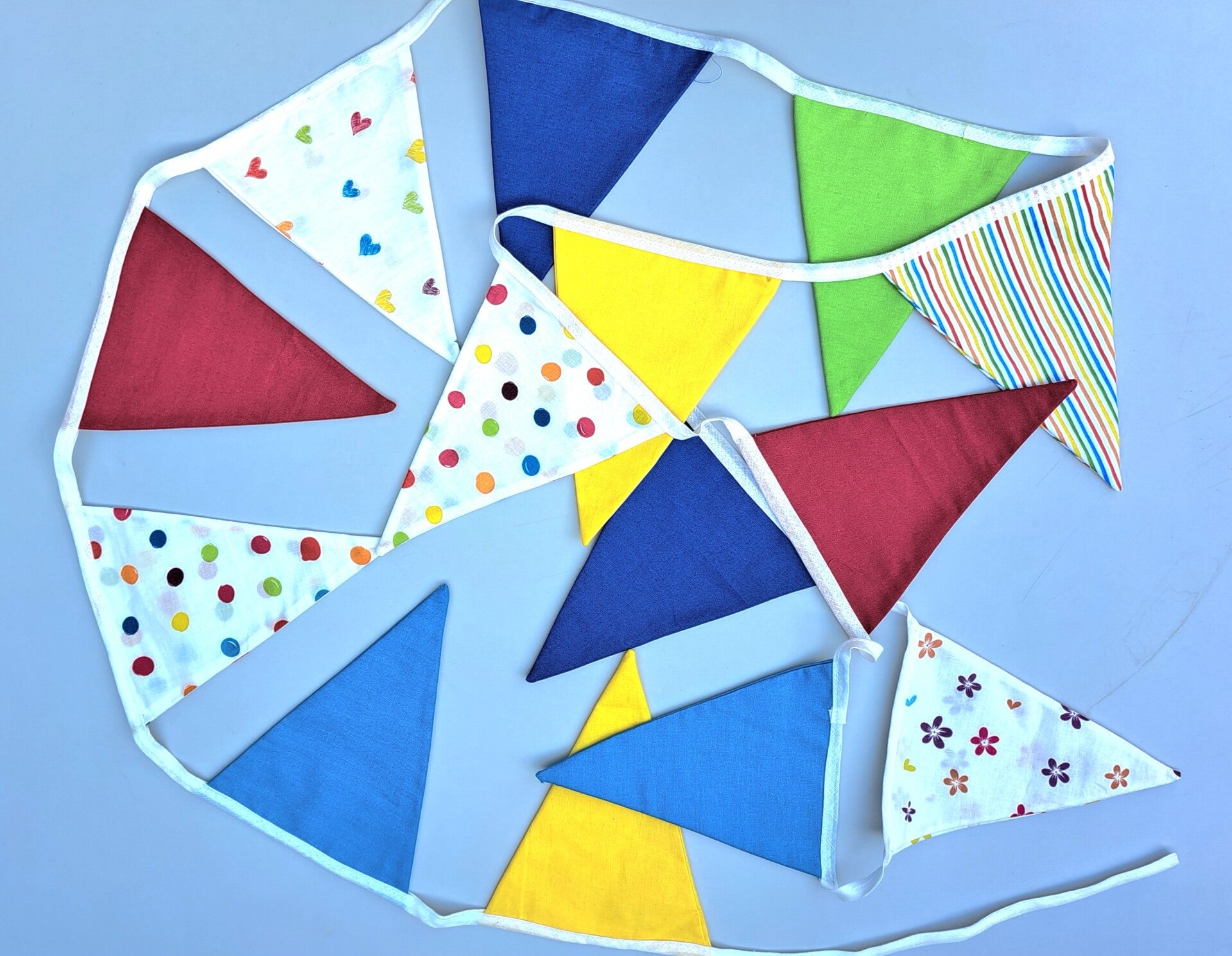 Vrolijke vlaggenlijn voor een gezellig feestje, gemaakt van katoenen stof, dubbel uitgevoerd.