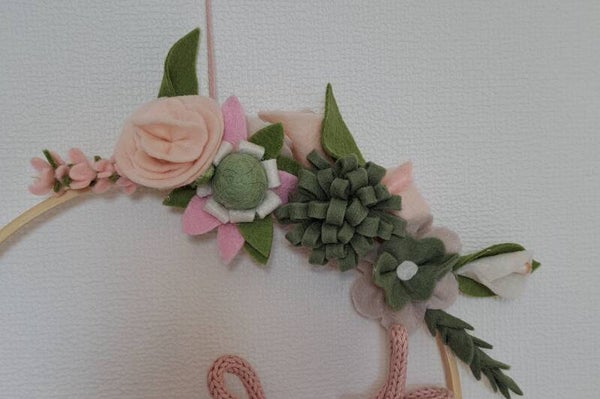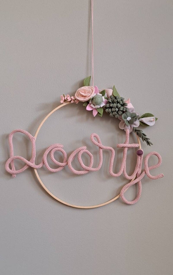 Leuk als geboorte kado, punniknaam versierd met vilten bloemen.