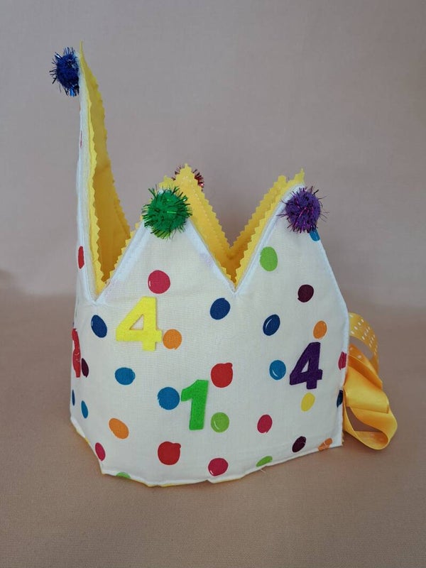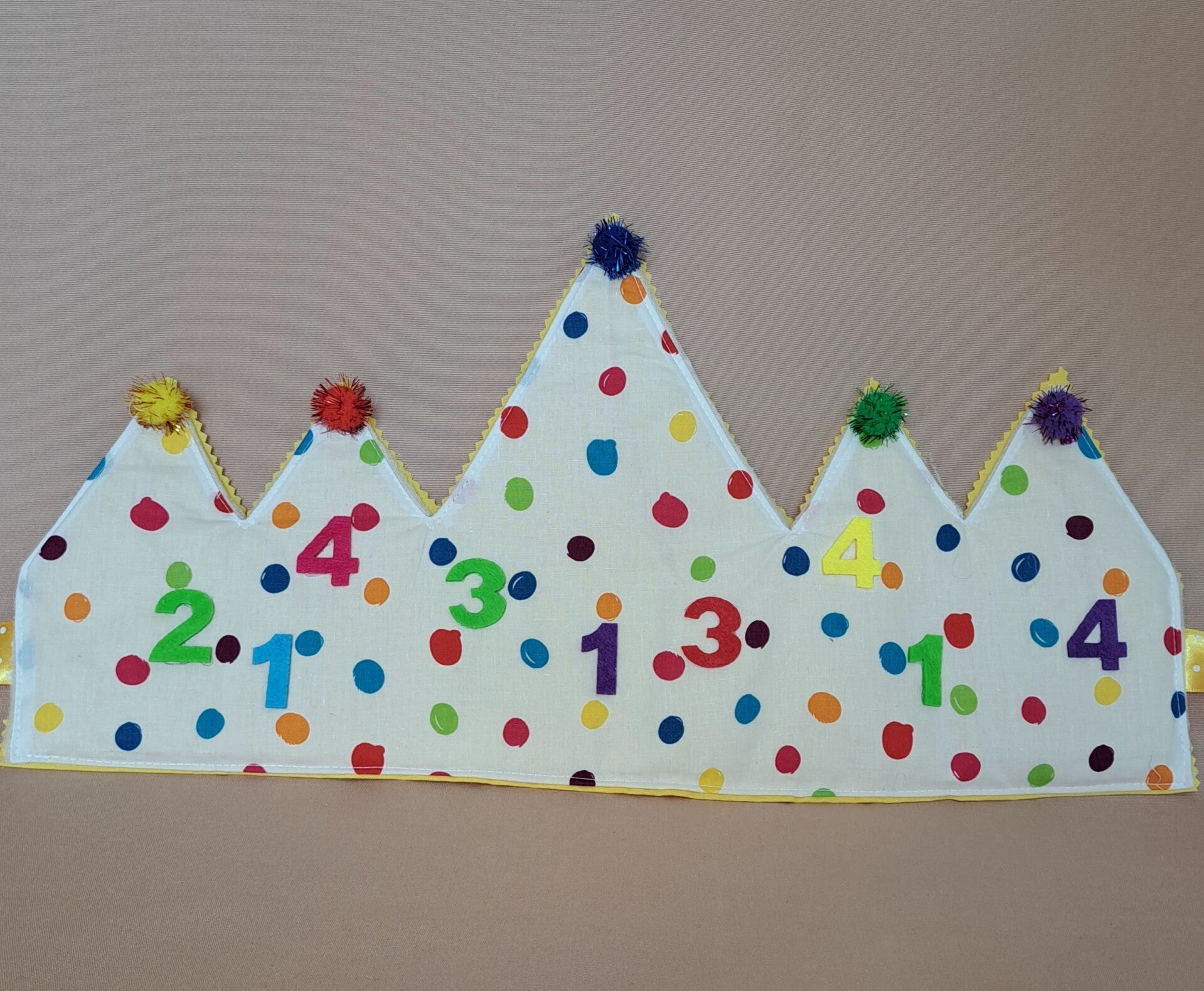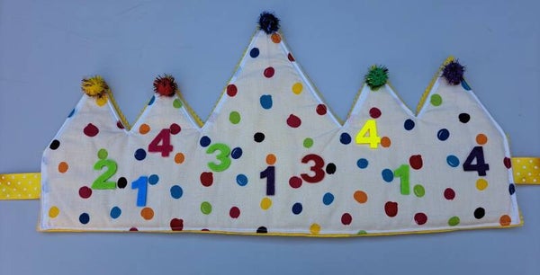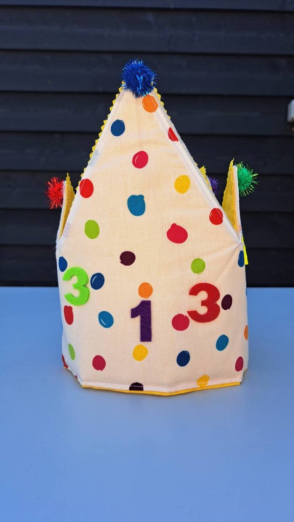 Vrolijke noppenkroon, versierd met cijfers van vilt. gemaakt van dubbele katoenen stof met daartussen fiberfill.