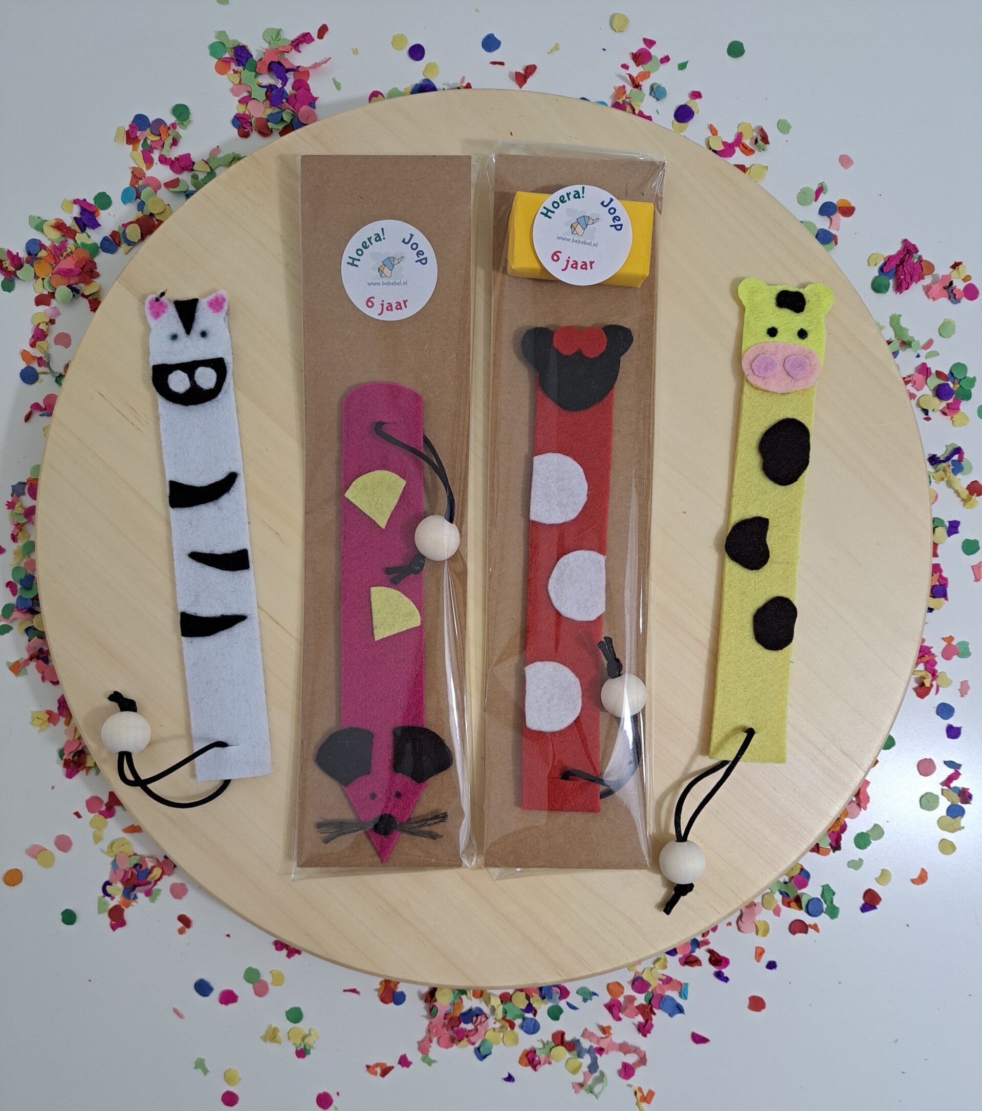 Hij wordt verpakt in cellofaan met daarop een sticker, hoera naam en leeftijd van het kind.