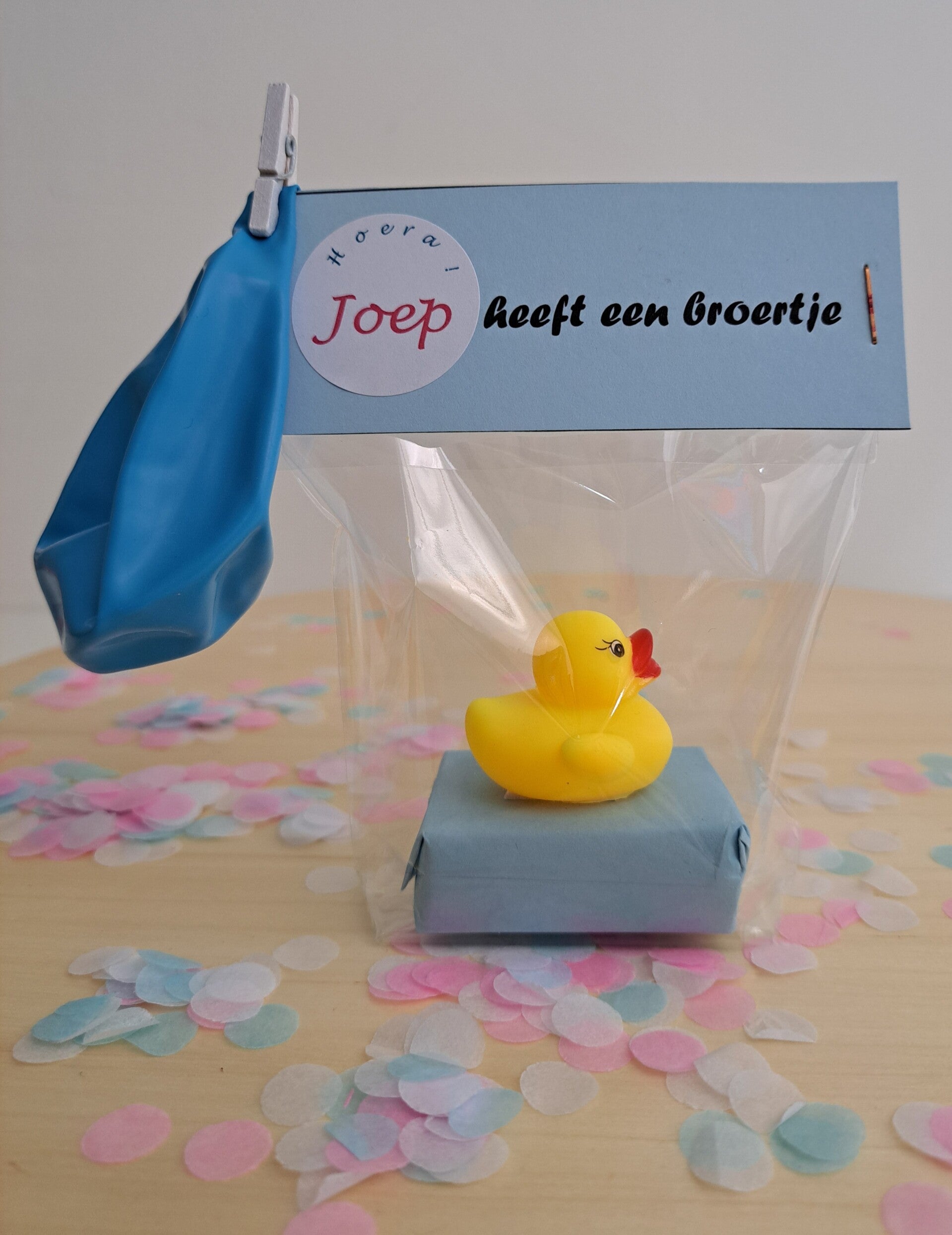 Verpakt in cellofaan zakje met label Hoera "naam"heeft een zusje/broertje en een ballon bevestigd met knijpertje.