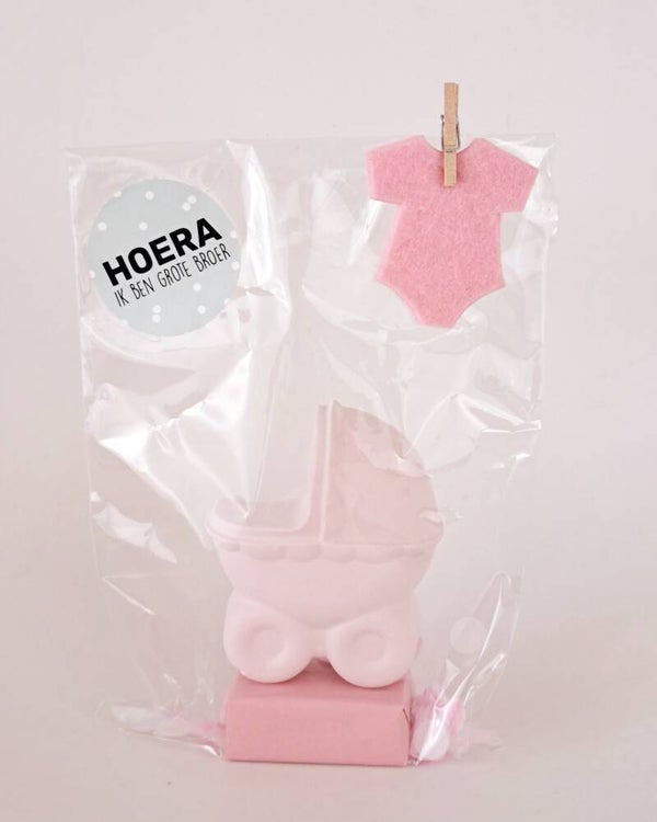 leuke Stoepkrijt (4x7cm) traktatie, verpakt in cellofaan zakje met daarop sticker ik ben grote broer/zus en een leuk vilten rompertje vast gemaakt met knijpertje. verkrijgbaar in roze en blauw.