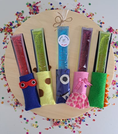Verpakt in cellofaan zakje met label waarop een sticker met, Hoera naam en leeftijd van het kind.