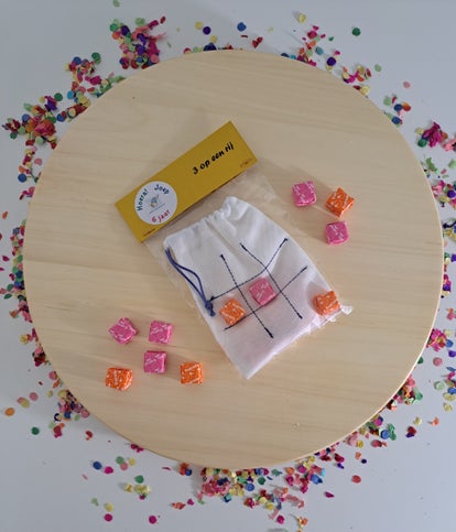 Katoenen zakje waarop drie op een rij spel gespeeld kan worden met de 8 fruitella snoepjes in twee kleuren die erin zitten.